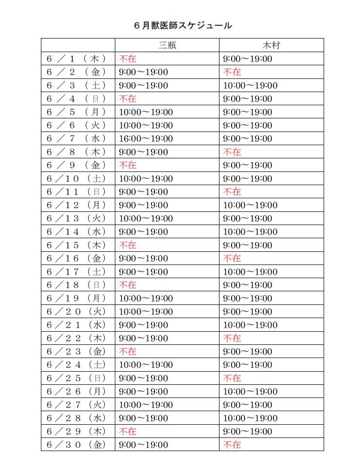 6月獣医師スケジュールについて