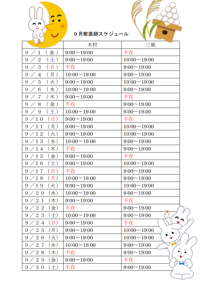 9月30日の獣医師スケジュールに変更がありましたのでお知らせ致します。