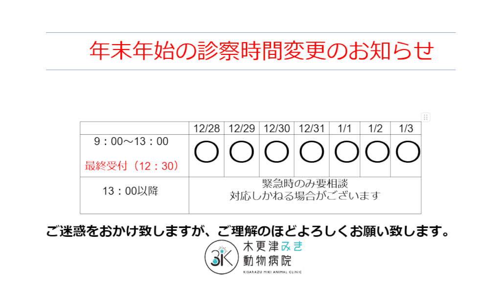 年末年始の診察時間変更のお知らせです。