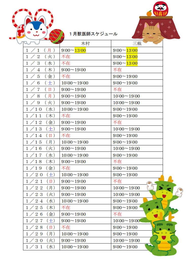 1月13日の獣医師スケジュールに誤りありましたので変更をお知らせ致します。