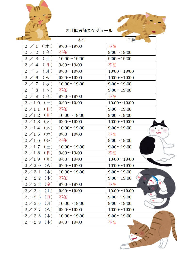 2月獣医師スケジュールについて🐈