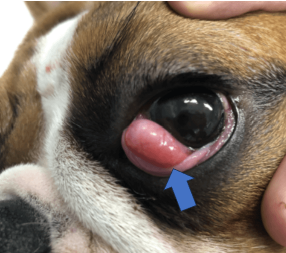 目頭側の青い矢印部分が脱出している瞬膜腺です。