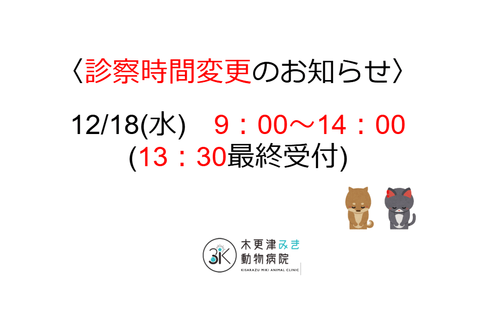 12/18(水)の診察時間が変更になりますのでお知らせいたします。