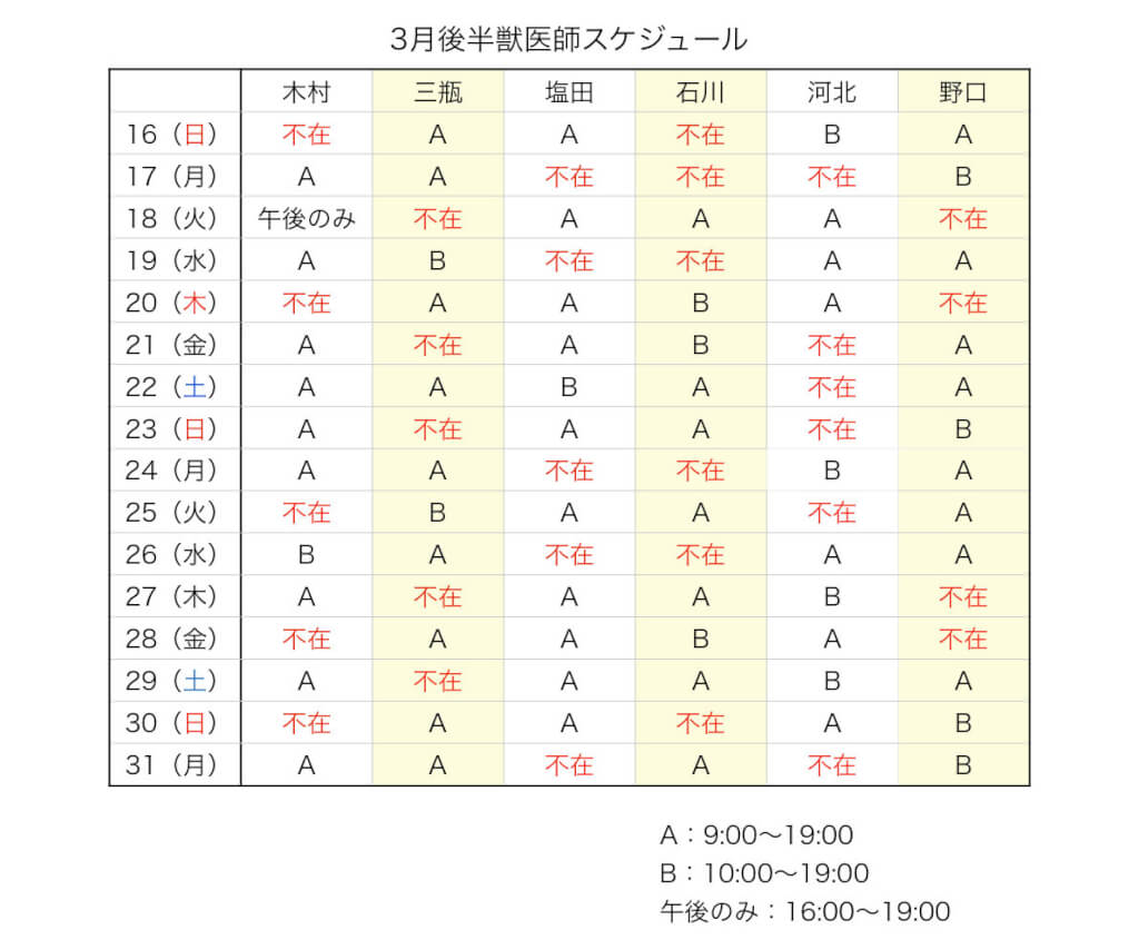 こんにちは!3月後半の獣医師スケジュールについてお知らせです。