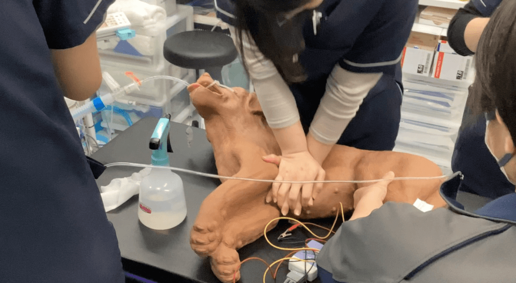 今回のトレーニングでは、実際の犬の心肺蘇生のトレーニングモデルを使って、