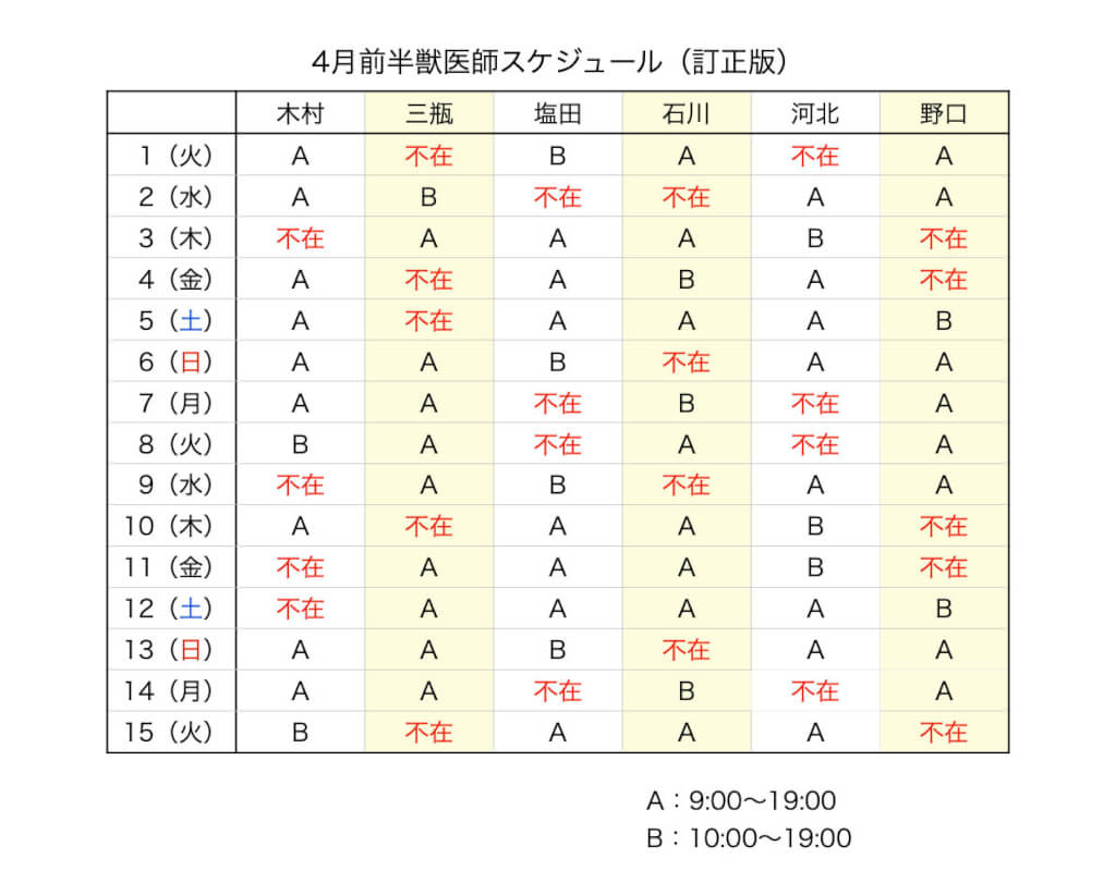 こんにちは!4月前半の獣医師スケジュールに変更があります。