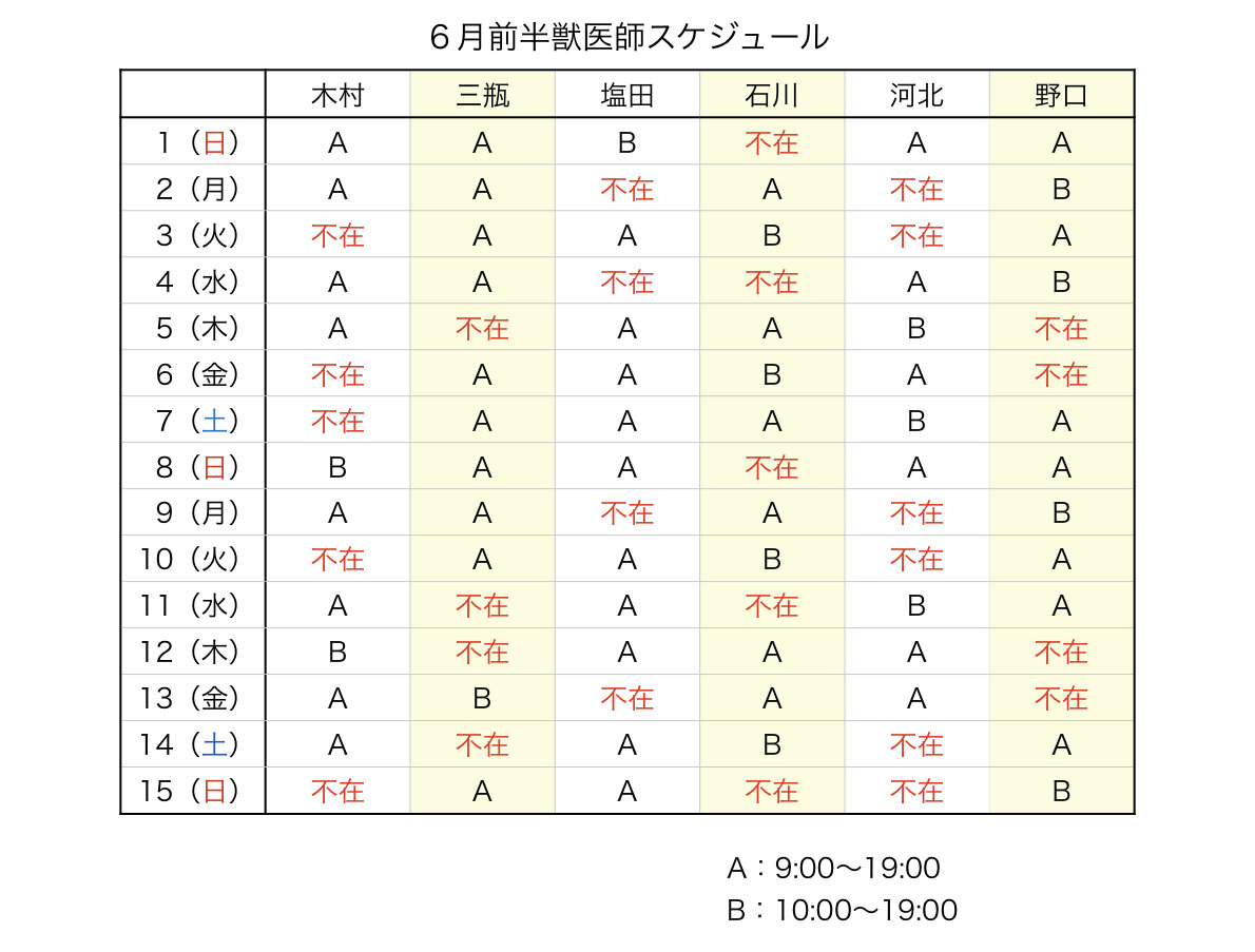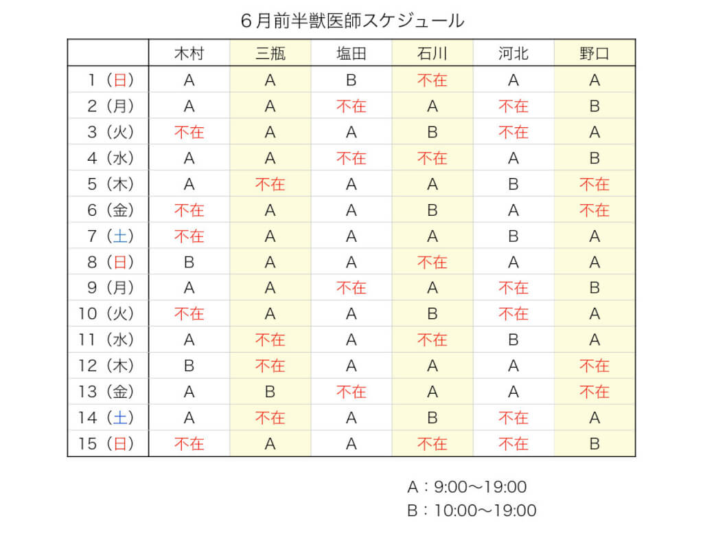 こんにちは!6月前半の獣医師スケジュールについてお知らせです。