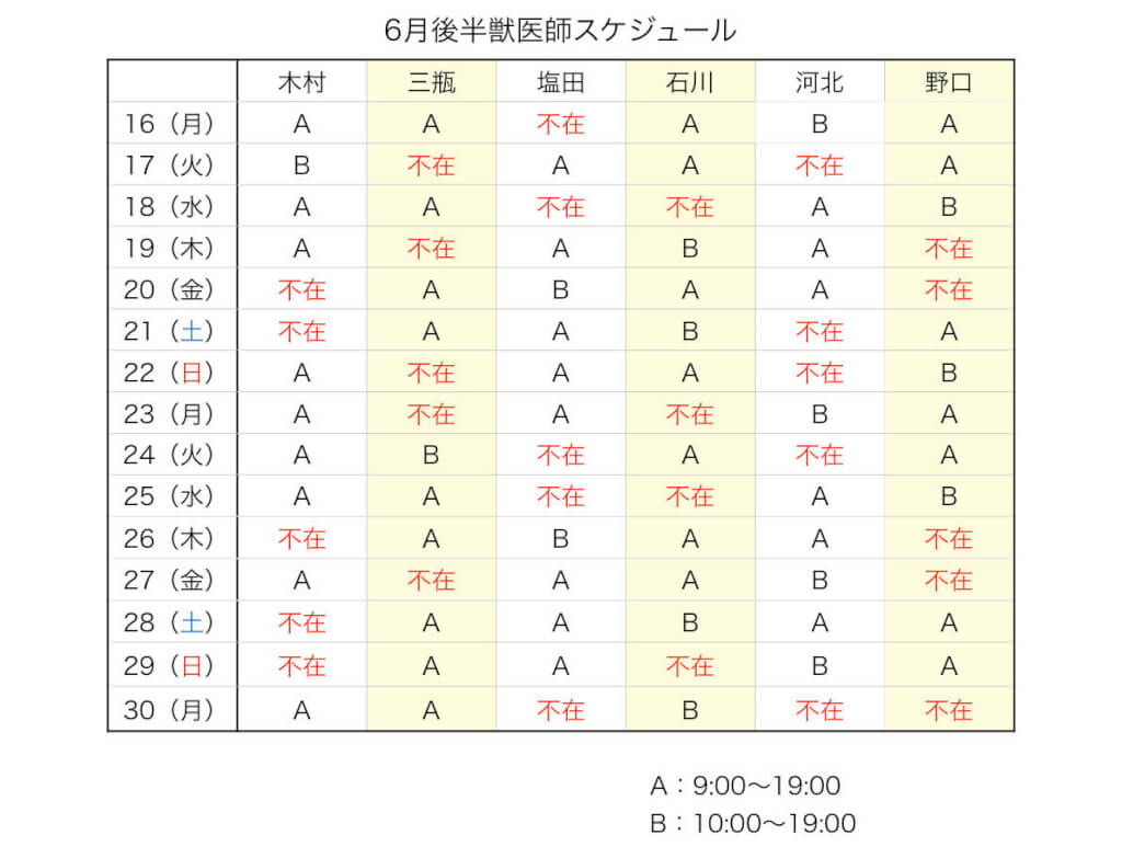 こんにちは!6月後半の獣医師スケジュールについてお知らせです。