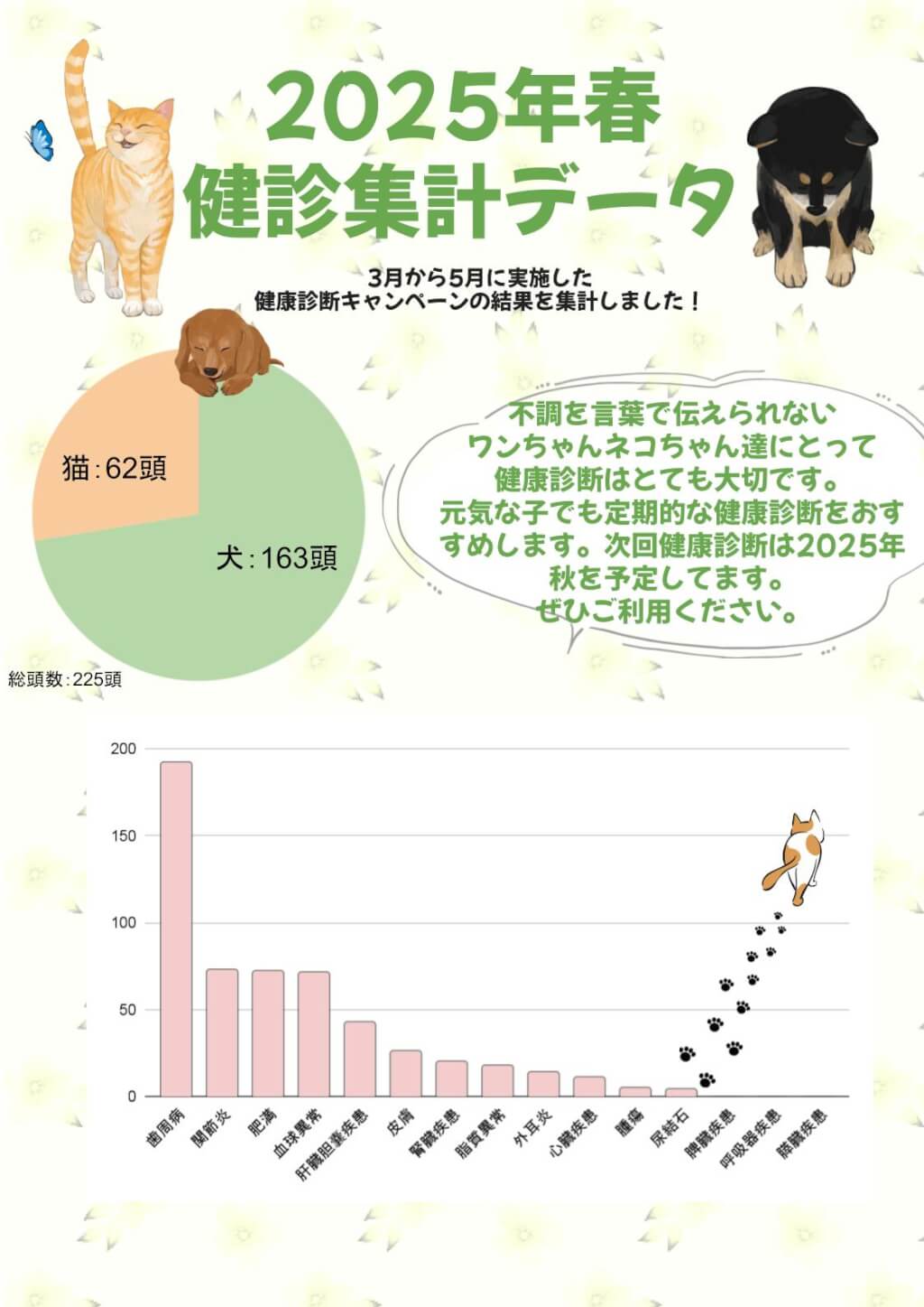 今回の健康診断は総数225頭のワンちゃんネコちゃんが利用してくださいました!
