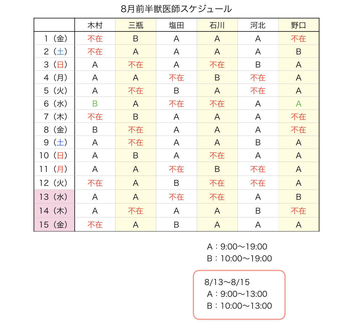8月前半の獣医師出勤スケジュールに変更がございましたので掲載いたします。確認お願いします。