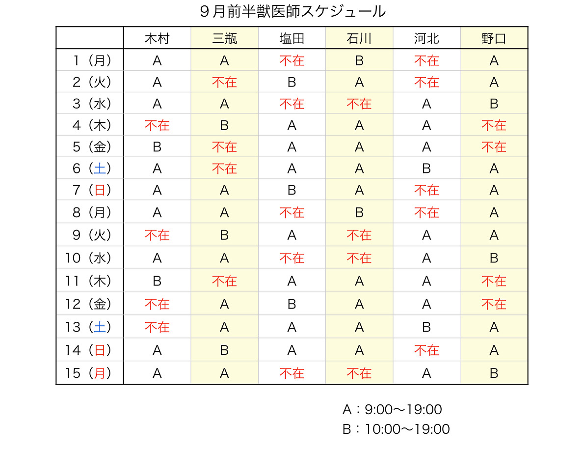 こんにちは!9月前半の獣医師スケジュールについてお知らせです。