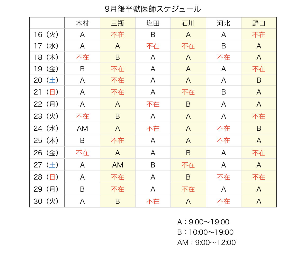 こんにちは!9月後半の獣医師スケジュールについてお知らせです。