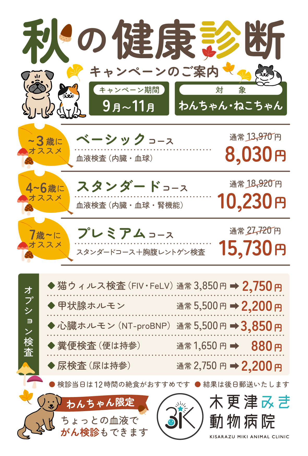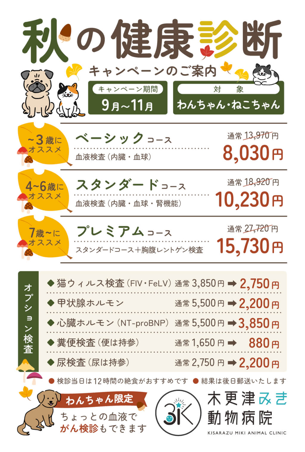 木更津みき動物病院では、現在 秋の健康診断キャンペーン を実施しています。