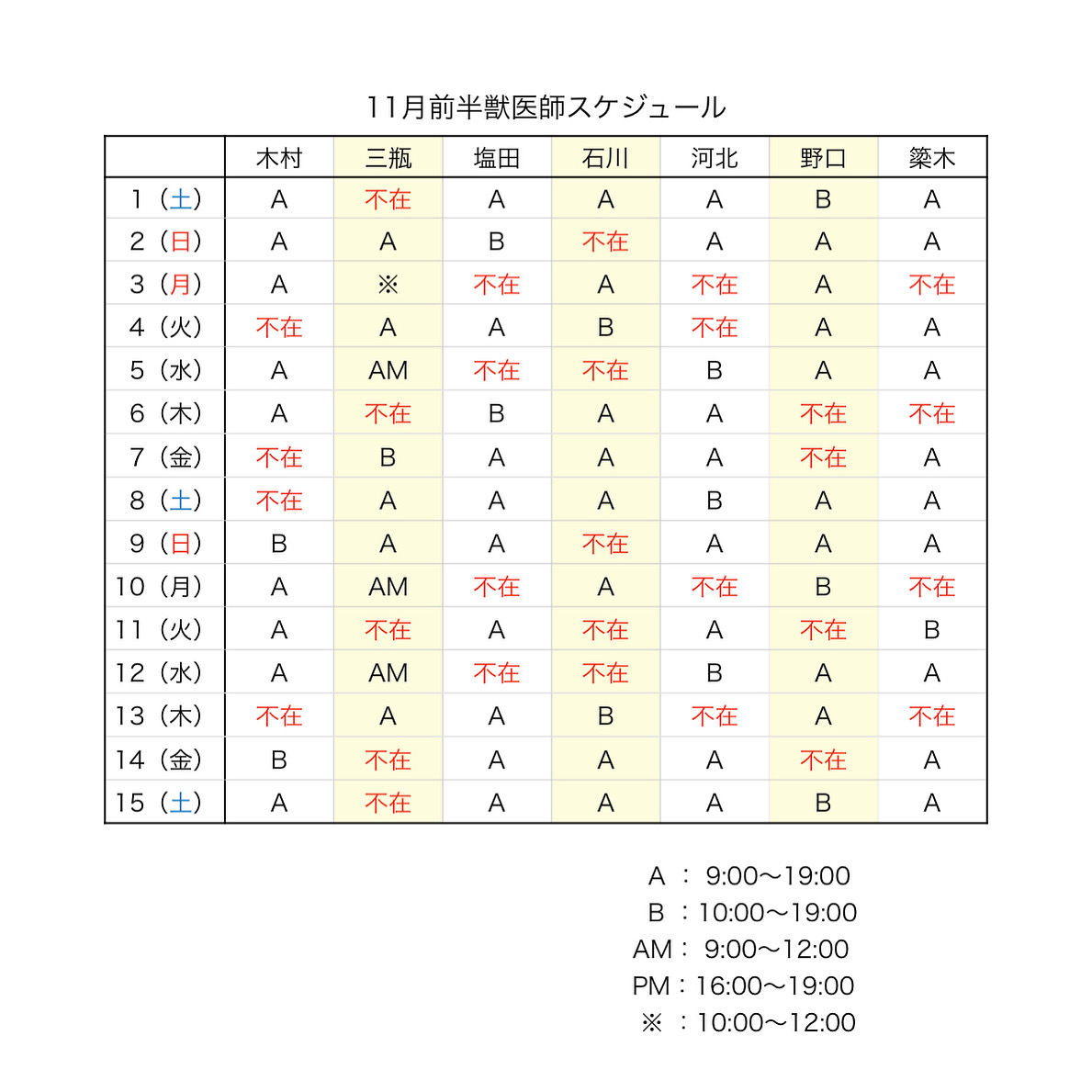 こんにちは!11月前半の獣医師スケジュールについてお知らせです。