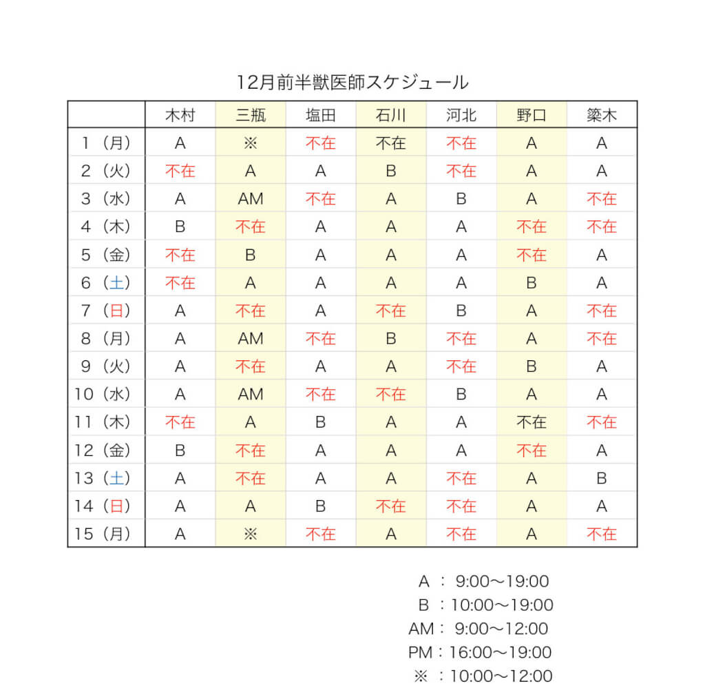 こんにちは!12月前半の獣医師スケジュールについてお知らせです。