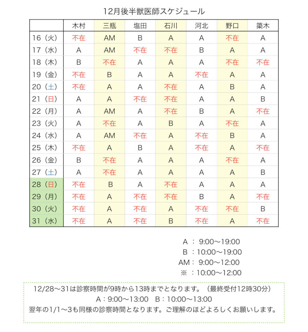 こんにちは!12月後半の獣医師スケジュールについて訂正があります。