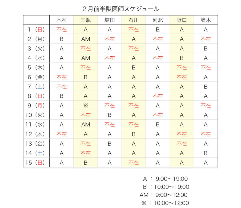 こんにちは!2月前半の獣医師スケジュールについてお知らせです。