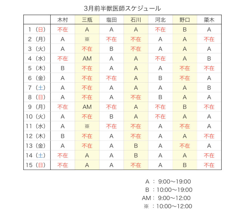 こんにちは!3月前半の獣医師スケジュールについてお知らせです。