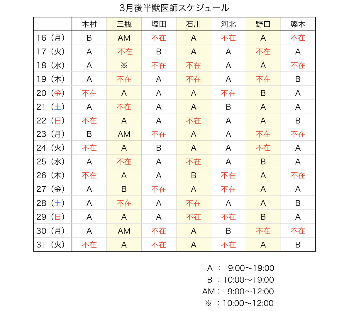 こんにちは!3月後半の獣医師スケジュールについてお知らせです。