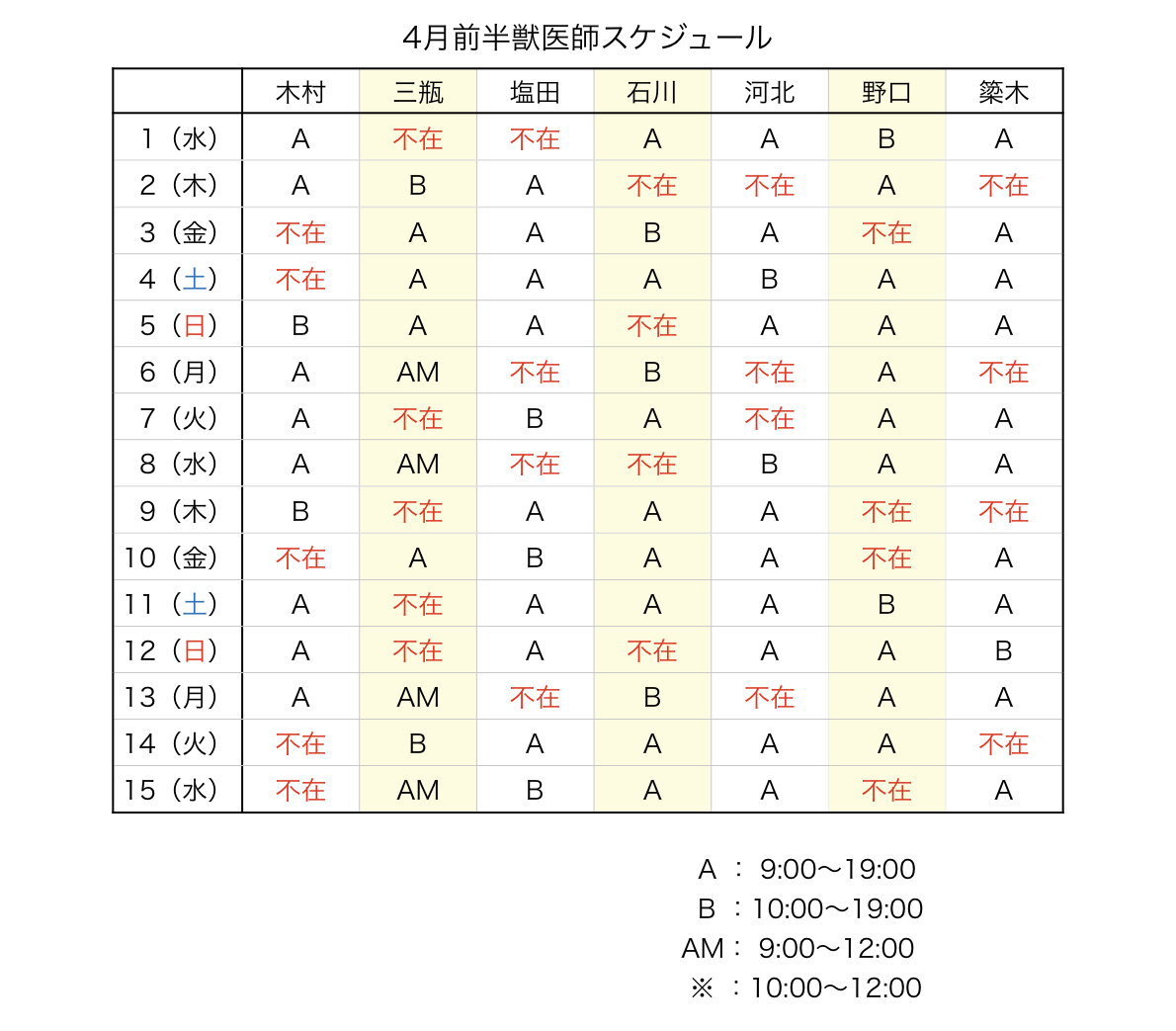 こんにちは!4月前半の獣医師スケジュールについてお知らせです。